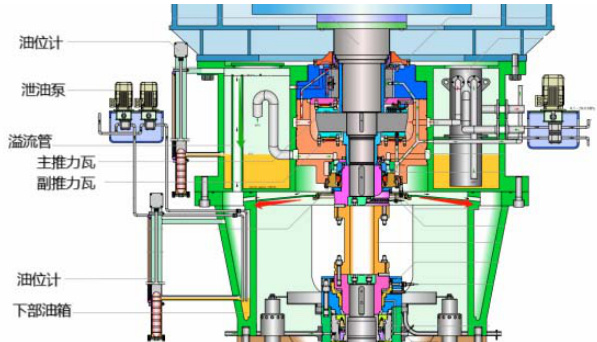主泵的润滑油系统包括上部、中部和下部油箱,上部油箱为电机轴承提供润滑油,中部油箱为双向推力轴承提供润滑油,下部油箱用于收集回油。主泵的润滑油系统包括4 路油路,分别如下:第一油回路:顶油泵从中部油箱吸入润滑油,直接泵送至轴承的主、副推力瓦,然后返回至油箱中;第二油回路:油叶轮从中部油箱吸入润滑油,泵送至轴承的轴承的主、副推力瓦,泵和电机的径向轴承。第三油回路:油密封的下部分泄漏量流至下部油箱;第四油回路:泄油泵通过油位触发启动,将下部油箱的润滑油输送至电机顶部油箱,通过电机回油管返回中部油箱,简图见图2.1。