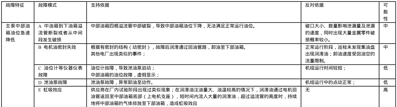 故障模式 B:组织开展主泵进岛检查,未发现有润滑油泄漏至积液盘上;电机上端呼吸阀周围有少量漏油,横向对比检查其他两环主泵呼吸阀周围,排除漏油情况;通过正式启泵的验证方案,在中部油箱中低运行油位下,有密封的运行正常,且未再现故障情况;因此排除该单一因素模式及相应的组合模式。