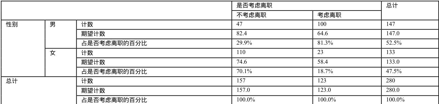 为进一步探讨性别与职业稳定性之间的关系,本文以“ 是否考虑离职” 作为衡量指标,进行交叉列联分析与卡方检验。