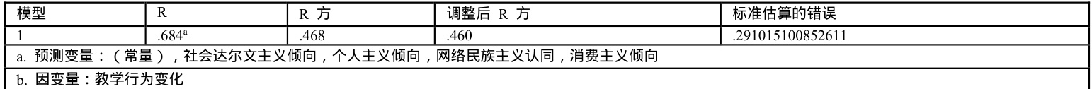 回归分析结果表明,该模型在解释青年教师教学行为变化方面具有较好的拟合效果。R 值为 0.684,显示所有社会思潮变量与教学行为变化之间存在较强的整体相关性; R2 为 0.468,说明四个思潮变量可共同解释教学行为变化约 46.8% 的变异,具有较强的解释力;调整后 R2 为 0.460,与 R2 差异较小,说明模型在控制样本误差后仍具有良好的稳定性和可靠性;同时,标准估算的错误为0.291,表明预测值与实际观测值之间的平均误差较小,拟合效果较理想。综上,该模型能够较为有效地揭示社会思潮对青年教师教学行为变化的影响。