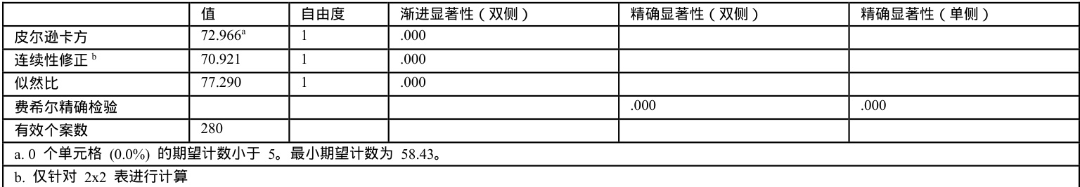 卡方检验结果显示:皮尔逊卡方值为72.966,自由度1,显著性 p=0.000 ;连续性修正卡方值为 70.921, p=0.000 ;似然比、Fisher 精确检验等其他指标也均表明该差异高度显著。因此,研究结论为:男性青年教师相比女性,更可能存在离职意向,职业稳定性相对较弱。