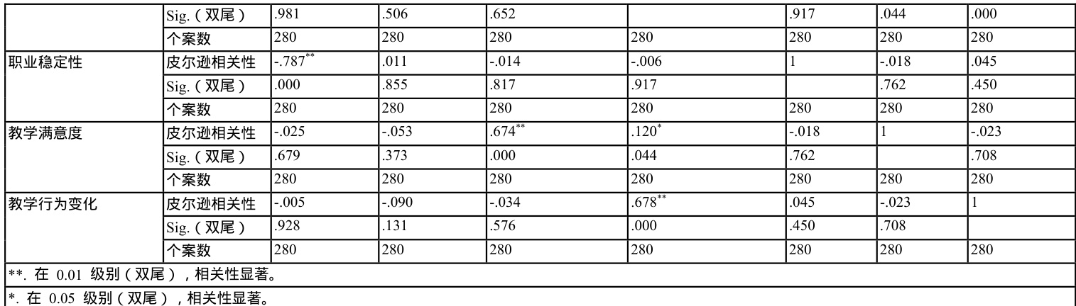 相关分析的目的是查看变量之间线性相关性。下表展示了个人主义倾向、消费主义倾向、网络民族主义认同、社会达尔文主义倾向、职业稳定性、教学满意度、教学行为变化这七个变量之间的相关系数(Pearson Correlation)和显著性水平(Sig.双尾)。