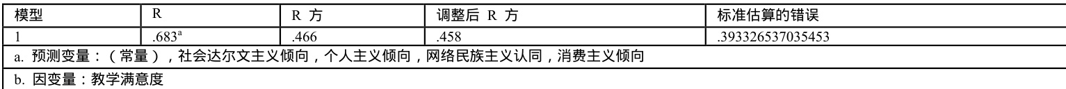回归分析结果显示,该模型在预测青年教师教学满意度方面具有较好的拟合效果。R 值为 0.683,表明各社会思潮变量与教学满意度之间具有较强的整体相关性; R2 为0.466,说明具有中等偏强的解释力;调整后 R2 为0.458,在控制变量数量后模型的稳定性仍然较好,回归结果可信;同时,标准估算的错误为0.393,说明模型预测值与实际值之间的平均误差较小。整体来看,该模型在解释教学满意度方面表现良好,验证了社会思潮对青年教师教学态度具有一定的影响力。