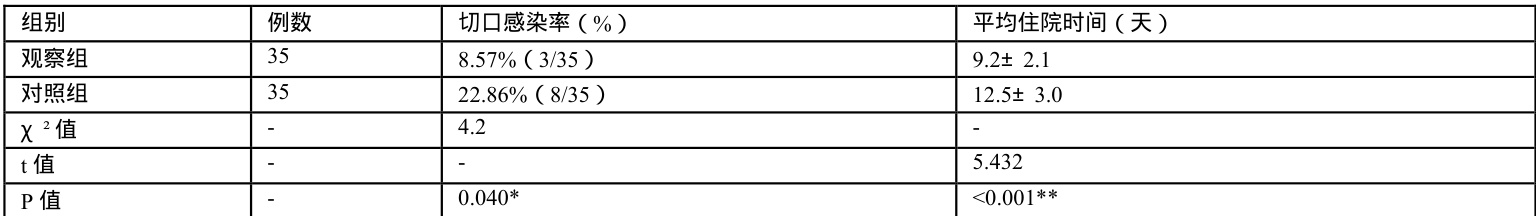 研究结果表明,观察组术后切口感染率为 8.57% (3/35),显著低于对照组的 22.86% (8/35),差异具有统计学意义(