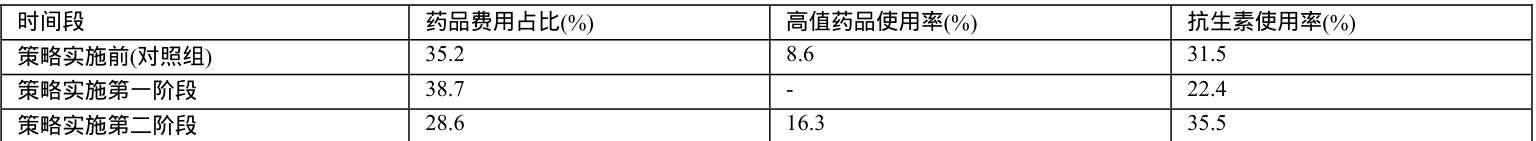 资料统计显示,实施药品成本控制策略后,药品费用占比、高值药品使用率及抗生素使用率等核心指标均呈现显著改善趋势(表1)。