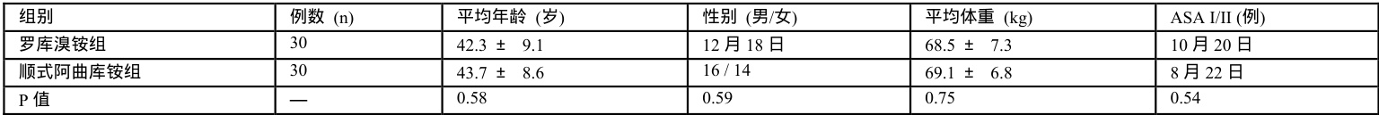 本研究纳入60 例患者,分别随机分入罗库溴铵组和顺式阿曲库铵组,每组30 例。两组患者在性别比例、年龄分布、体重及 ASA 分级等基本人口学特征方面差异无统计学意义,说明随机分组较为均衡,能够保证后续肌松效果比较的科学性与客观性。罗库溴铵组患者平均年龄为 42.3±9.1 岁,顺式阿曲库铵组为 43.7±8.6 岁,组间差异不显著( P=0.58) 。性别比例方面,罗库溴铵组男性 18 例,女性 12 例,顺式阿曲库铵组男性 16 例,女性 14 例,差异无统计学意义( P=0.59. )。两组患者平均体重分别为68.5± 7.3kg 和 69.1±6.8kg ,体重差异也未达到显著水平( P=0.75 )。ASA 分级分布显示,两组均以 I 级患者为主,罗库溴铵组 20 例 I 级、10 例 II 级,顺式阿曲库铵组22 例I 级、8 例II 级,差异同样无统计学意义( P=0.54 )。