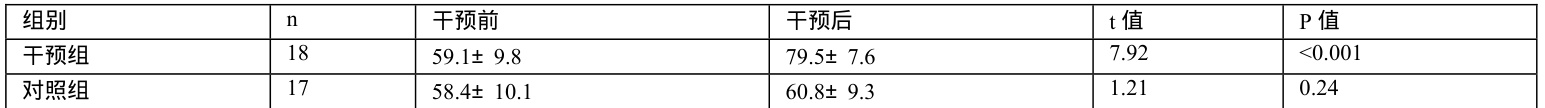 表示,组间比较采用独立样本t 检验,组内干预前后比较采用配对t 检验;计数资料采用χ ²检验; P<0.05 为差异有统计学意义。