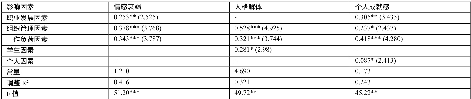 数据分析表明(如表 1 所示),工作负荷与组织管理对情感衰竭、人格解体和个人成就感均具显著预测作用,职业发展因素显著解释情感耗竭与成就感变异,学生因素主要预测人格解体维度,个人因素仅关联个人成就感。