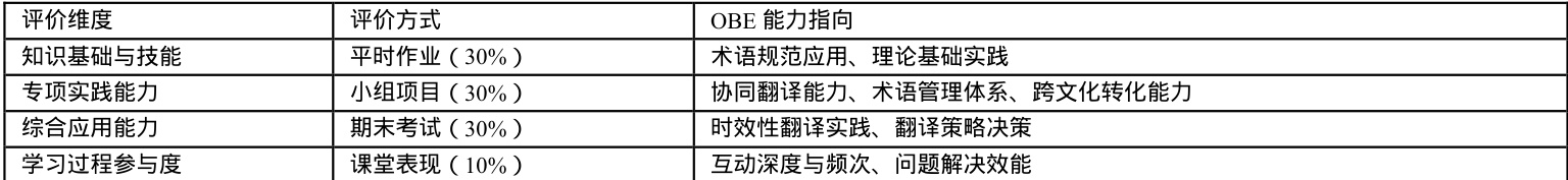 (三)评价方式单一化: 传统笔试主导的单一评价模式过度依赖标准化测试,难以全面、客观地衡量学生在翻译实践、批判性思维、跨文化沟通等维度的综合素养。现行评价体系无法有效捕捉学习过程中的动态成长轨迹与能力短板,亟需构建契合OBE 理念的多元化、过程性评价体系。整合项目成果评估、同伴互评、持续性学习反馈报告等机制,实现对学生在知识掌握、能力发展、素养养成等多维度成长轨迹的动态追踪与精准诊断,确保评价结果真实反映教学目标达成度,从而全链条驱动教学质量提升。