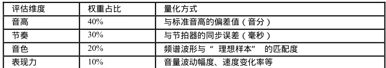 弗莱雷(Freire, 1970)在《被压迫者教育学》中批判了传统的“ 银行储蓄式教育” ,认为这种教育模式将知识简化为可存储的信息单元,使学生成为被动接受知识的容器。类似地,当前声乐 AI 教学工具通过预设的评估标准,将复杂的艺术表现简化为音准偏差率、节奏准确度等技术参数。这种操作不仅限定了学习的范围,更通过算法反馈机制实施着隐性的教育规训。以这个例子来说,某主流声乐AI 软件将演唱评估分为“ 音高” (占比 40% )、cc 节奏” ( 30% )、“ 音色” ( 20% )和“ 表现力”10% )四个维度,这种权重分配本身就体现了特定的艺术价值观。这种权重分配(见表1)本质是将 “ 技术可测量性” 置于艺术价值之上。正如弗莱雷所言,“ 压迫者通过定义‘ 知识的标准’ 来维持霸权” ,当 AI 将 “ 表现力” 压缩为 10% 的权重时,实际是在暗示:情感表达的重要性仅为音高的 1/4