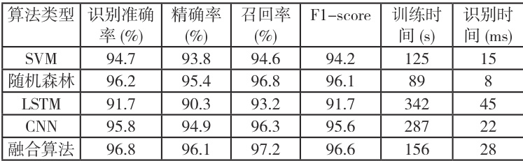表格数据表明融合算法在综合性能方面具有明显优势,识别准确率最高达 96.8% ,兼顾了识别精度和计算效率的平衡要求。