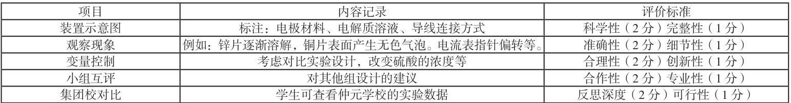 1.基础探究:原电池的构成条件验证。在课堂中,老师提供锌片、铜片、稀硫酸、导线、电流表等材料,要求学生设计“能使电流表偏转的装置”。期间学生以小组为单位设计原电池方案,通过手绘示意图阐释原电池工作原理,在电极材料与电解液的自主筛选中展开深度探究。根据探究实验,做好实验记录表,集团内建立的实验数据库使不同学校小组能实时对比参数。
