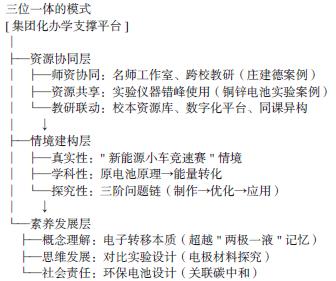 如图所示,集团化办学通过资源协同层为情境建构层提供物质基础,而深度教学则通过情境设计将资源转化为素养发展层的载体。