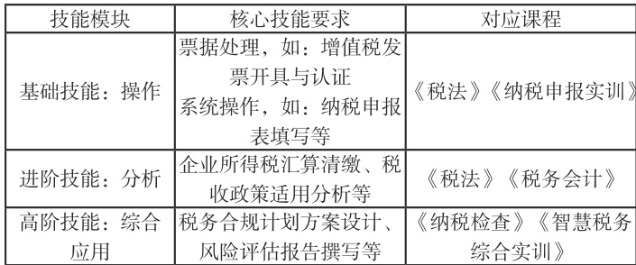 本研究选取制造企业、商贸企业、会计师事务所、税务师事务所等9 家单位,对办税员、税务会计、税务顾问等岗位进行调研,总结出三大核心涉税技能需求。基础技能主要为各类系统操作,包括税务登记、发票管理、纳税申报等;进阶技能主要为展开专业分析,涵盖税收政策解读、应纳税额核算、税收风险识别等;高阶技能则为综合应用,如税务合规计划、税务争议处理、跨部门协作等。