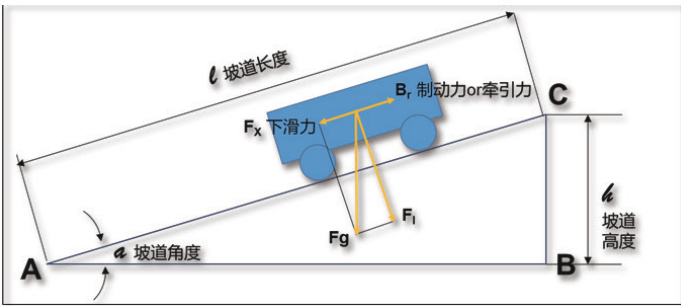 列车在坡道上的下滑力来源于重力沿坡道方向的分量。设列车总质量为 P+G ,其中 P 为机车质量,G 为车辆质量,坡道倾角为 α,则列车重力Fg 为: