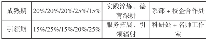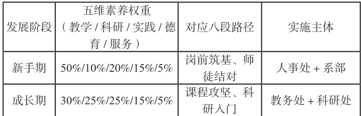 新手期(岗前筑基、师徒结对)、成长期(课程攻坚、科研入门)、成熟期(实践淬炼、德育深耕)、引领期(服务拓展、引领辐射)。