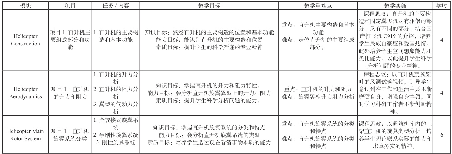 《旋转翼飞机》是飞机机电维修(涉外)专业、飞机结构修理(涉外)专业的专业核心课程。该课程基于民航行业标准和机务维修工作过程,以国内外各通航公司普遍使用的直升机主要机型为例,主要向学生介绍直升机的部件组成和功用、直升机的升力和阻力、直升机旋翼系统、直升机旋翼飞行操纵系统、反扭矩系统、直升机传动系统、前飞的飞行原理、直升机自转飞行、直升机的安全注意事项等内容。