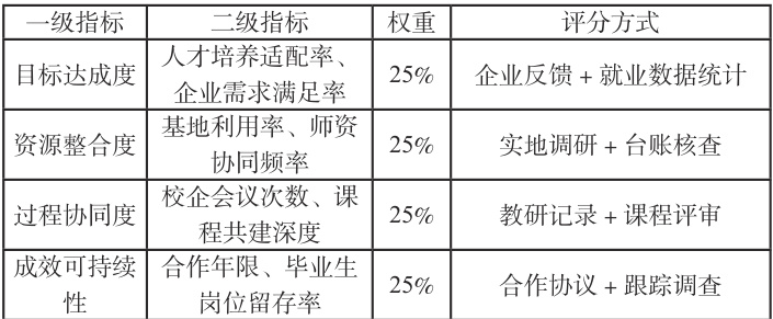 围绕 “目标达成度、资源整合度、过程协同度、成效可持续性”设置 12 项核心指标(见表 1),采用量化与质性结合的方式评分,满分 100 分,80 分以上为优秀项目。