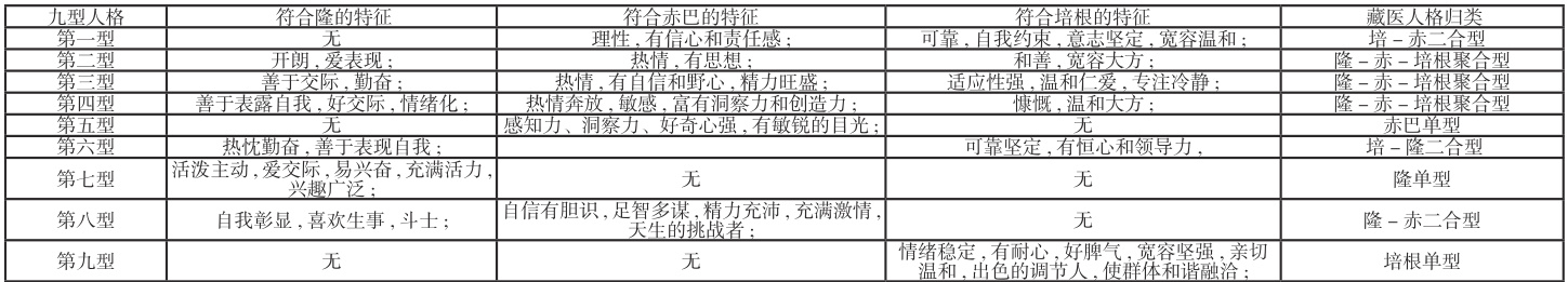 两者的对应关系为 : 隆单型 ≈ 第七型 , 赤巴单型 ≈ 第五型 , 培根单型 ≈ 第九型 , 隆 -赤二合型 ≈ 第八型 , 培 - 赤二合型 ≈ 第一型 , 培 - 隆二合型 ≈ 第六型 , 隆 - 赤 - 培根聚合型≈第二型、第三型、第四型。