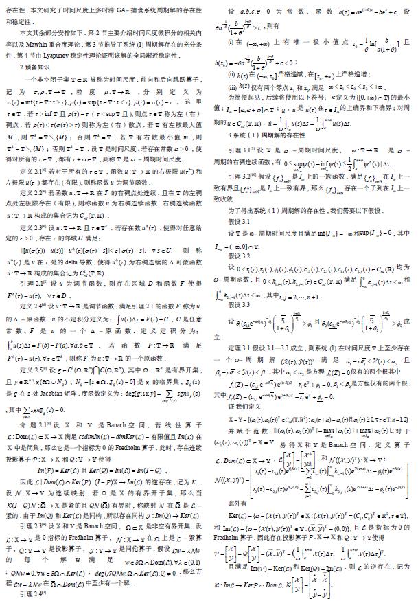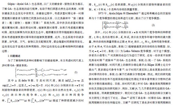 时间尺度上多时滞 GA- 捕食系统周期解的存在性和稳定性研究