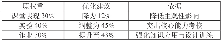 2、优化过程评价:进一步优化过程性考核的具体构成 (如各环节的评价标准、权重占比)和数据类型 (如量化成绩、质性记录如实验报告评语、课堂互动记录等),避免“过程性考核”概念模糊。优化后的过程化权重如表2 所示。