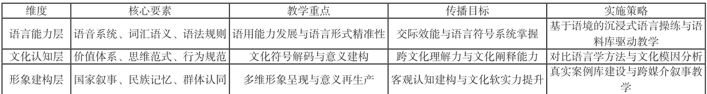 基于上述分析,本研究建构了 " 语言能力建构 - 文化认知深化 -国家形象塑造 " 三维互动教学范式(见图 1),系统解构中文教学中语言功能与文化功能的互构性关系,形成具有解释力的跨文化传播教学理论框架。