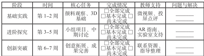 基础实践阶段,聚焦技能夯实,教师引导学生完成“岩彩颜料的组成观察” “3D软件的基本操作”等基础任务,通过微视频如“上胶技巧分解”的视频辅助教学,利用手机对学生的操作过程进行实时拍照和投屏点评,有助于学生对核心技能的掌握;进阶探究阶段围绕预设项目进行探究:以“AR 岩彩作品展览”项目为例,首先让学生了解 AR 技术的基础原理,然后尝试在岩彩作品中捆绑AR 标记,教师针对“AR 标记识别不够准确”等问题提供技术支持,鼓励学生通过多次测试调整标记位置与作品摆放角度;创新突破阶段,支持学生自主拓展:如部分小组在完成基础项目后,提出“以岩彩做成能发光的书签”的创意,教师引导其查阅发光材料知识,帮助联系本校实验室取得安全的发光原料,使学生在自主探索的过程中打破常规、加深科创实践。