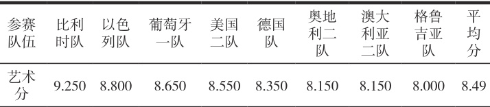 根据表 1,第 28 届世锦赛女子三人项目前八名平均艺术分为 8.49,只有比利时队超过 9 分,高出平均值 0.76 分,显示出显著优势。总体来看,比利时队在艺术表现上明显领先,其他队伍差距较小。