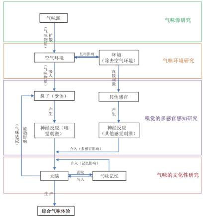 2004 年度诺贝尔生理学或医学奖得主美国科学家 Richard Axel 和 Linda B ∇⋅ε Buckei博士的研究成果阐述了人体对于嗅觉的感知机理,其阐释了人体产生嗅觉的基础是基于气味物质刺激气味受体 , 同时人体的气味受体只表达一种嗅觉气味基因,证明了人体对于复杂气味的感知是基于不同气味物质的组合;同时其研究也证明了人体对于记忆气味的机理 [5]。基于人体对于嗅觉的感知机理研究成果,结合嗅觉疲劳、气味记忆、多感官感知等原理,构建关于气味景观下的气味体验产生流程(图 2),并对气味体验产生中的各过程进行分类,提出气味景观研究的四个方向:气味源研究、气味环境研究、嗅觉的多感官感知研究和气味的文化性研究。