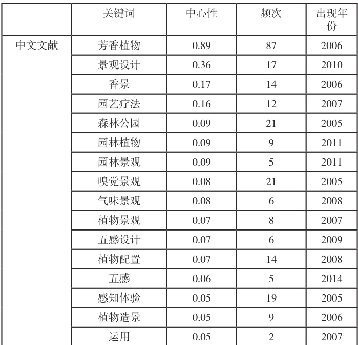在关键词共现图谱中,中文文献关键词共出现 290 个,连线 617 条,密度为 0.0147,可见国内研究分布较为分散。由于“气味景观”作为关键词被广泛运用时间较晚,且国内关于气味景观领域的早期的研究多以芳香植物的园林化运用为起点,故在关键词中心性和频次上以“芳香植物”(中心性 =0.89 ;频次 =87 )最为突出,同时出现景观设计(中心性 =0.36 ;频次 =17 )、香景(中心性 =0.17 ;频次 =14 )、园艺疗法(中心性 =0.16 ;频次 =12 )等次级关键词。国内气味景观研究领域文献关键词网络结构显著(聚类模块值 Modularity,Q=0.6778),结果可信度较高(聚类平均轮廓值 Weightde mean silhouette, S=0.9378 )。外文文献关键词共出现 436 个,连线 1337 条,密度为 0.0141,研究分布也较为分散。出现频率最高的 5 个关键词为感知(Perception)、嗅觉(Smell)、气味(Odor)、景观(Landscape)、旅游业(Tourism)。国外气味景观研究领域文献关键词网络结构显著(聚类模块值 Modularity, 0=0.7501 ),结果可靠(聚类平均轮廓值 Weightdemean silhouette,S=0.6901)。