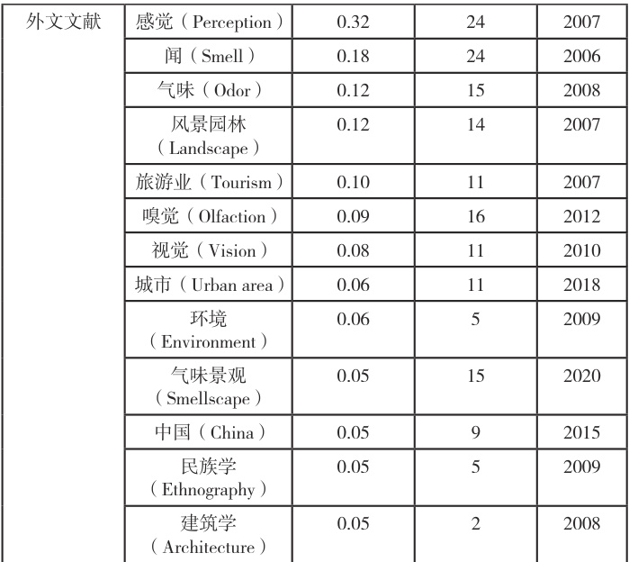 整体来看,国内外文献发文量波动上升,但国内外波动情况存在差异,气味景观研究总文献量与外文文献量趋势相近,而国内外发文量数量波峰与波谷位置相反。