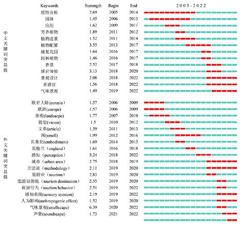 国外气味景观的突显内容在初期以“欧洲”最为显著,例如于 2005-2009 年出现了“欧亚大陆(Eurasia)”、“欧洲(Europe)”以及 2016-2018 年出现的“英国(England)”等突显词。2018 年开始国外研究对象从大尺度的地域性气味景观更小尺度的城市和旅游景点变更,出现了城市(Urban area)(2018-2022)、旅游业 Tourism(2019-2020)、旅游目的地 Tourist destination(2019-2020)、旅游行为 Tourist behavior(2019-2022)等关键词。同时感觉 Perception(2018-2022)、感知系统 Sensory system(2019-2022)等关键词出现后直到现在一直处于突显状态,这也证明了气味景观研究的重心处开始注重人的感知,同时视觉 Vision(2010-2012)、声景 Soundscape(2021-2022)等关键词,反映出气味景观多感官感知研究在嗅觉同其他感觉的综合研究已经开始陆续出现,气味景观多感官感知研究已成为国内外气味景观研究的热点方向。
