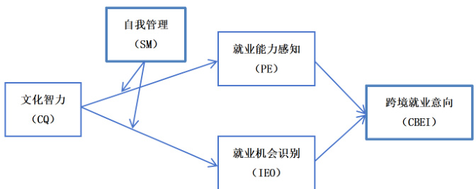 Lin et al(2022) 指出跨境就业意向(CBEI)是个人主动寻求或接受在非本国工作的意愿倾向和心理准备程度,跨境就业意向包括了心理倾向和行为准备两个方面的内容 Earley and Ang(2003) 将文化智力定义为个人有效适应新文化的能力,Gunn et al(2020)研究表明,文化智力对跨境就业意向的影响表现在认知评估、情感驱动和行为准备三个方面,高水平文化智力的人拥有丰富的跨文化知识储备,能够预见不同文化环境下可能遇到的工作风格差异、沟通习惯冲突和管理理念区别,通常具有更强的文化好奇心和冒险精神,将跨文化挑战视为个人成长契机而非威胁,更会采取具体行动提升自己的跨境就业竞争力。基于上述的研究,本文提出下列研究假设:本文提出下列研究假设:H1: 云南高职院校学生的文化智力对跨境就业意向呈现显著正向影响。