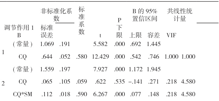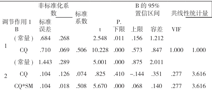如表 5 所示,SM 在 CQ 和 PE 的关系中调节作用显著,CQ 与 SM 交互项的P<0.01 , 系数为 0.112,起到了正向调节作用。如表 6 所示,SM 在 CQ 和 IEO 的关系中调节作用显著,CQ 与 SM 交互项的 P<0.01 , 系数为 0.104,起到了正向调节作用。因此H4 和H5 得到检验。
