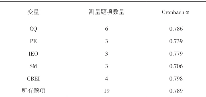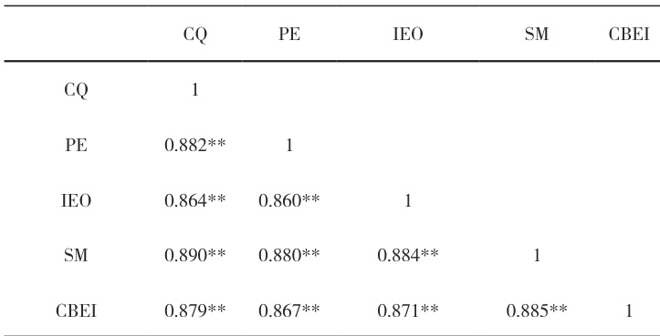 如表 1 所示,本文采用 SPSS20.0 软件处理,结果显示:CQ、PE、IEO、SM、CBEI 的 Cronbachα 系数分别为 :0.786、0.739、0.779.0.706、0.798,所有题项的 Cronbach ∝ 系数为 0.789,都大于 0.7,说明题项的信度可以接受。借助 MpLus8.0 软件,对本次模型拟合度检验,选择 CMIN/DF、RMSEA、SRMR、CFI、TLI 作为检验指标,结果如表2 所示:
