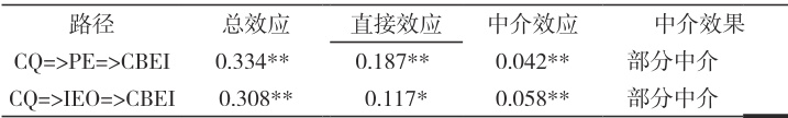 通过SPSS20.0 软件分析,CQ 与PE 之间呈现显著正相关( r=0.882,p<0.01 ),CQ 与IEO 之间呈现显著正相关( r=0.864,p<0.01 ), CQ 与 CBEI 之间呈现显著正相关( r=0.879,p<0.01 )。如表 3 所示,文化智力对跨境就业能力感知存在显著正向影响,文化智力对跨境就业机会识别存在显著正向影响,因此H2 和H3 得到了检验。文化智力对跨境就业意向存在显著正向影响,说明文化智力对跨境就业意向的直接作用显著,因此H1 得到了检验。