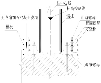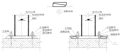 在钢柱安装过程中,首先需在柱体表面确定标高基准位置,随后采用水准测量仪器进行高差检测。对于高度及垂直度的校正,可通过调节柱脚底部的调平螺母来实现。此外,也可通过在柱脚底部增加或减少楔形垫片及垫块的方式进行微调。为确保结构稳定性,所有垫片与基础面及柱底之间必须保持均匀且紧密的接触。在进行二次混凝土浇筑之前,应对所有垫片实施焊接固定处理。若因螺栓长度限制导致无法正常调节时,可在基础面上加设水平垫板,具体方法是在钢柱四个角部放置垫板,同时由专业测量人员进行实时水平校准,确保钢柱一次性精准安装到位。需要注意的是,每组垫板的数量应控制在四块以内,并且需保证其与接触面的平整度和密实度。如下图2 所示: