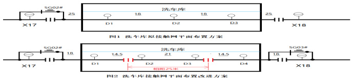改进方案是在库内增设 25 米的接触网无电区,无电区两侧设电分段(带分相功能),同时将原另一侧库外电分段增设带接地手动隔离开关;并对库内接触悬挂点安装位置进行了适当调整,详见图 3。在日常情况下,两端手动隔离开关为常闭状态,当库内接触网或其他作业检修时,开关打开并接地,确保检修安全。