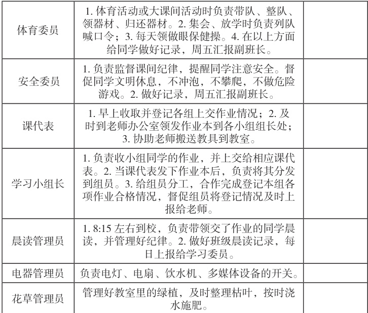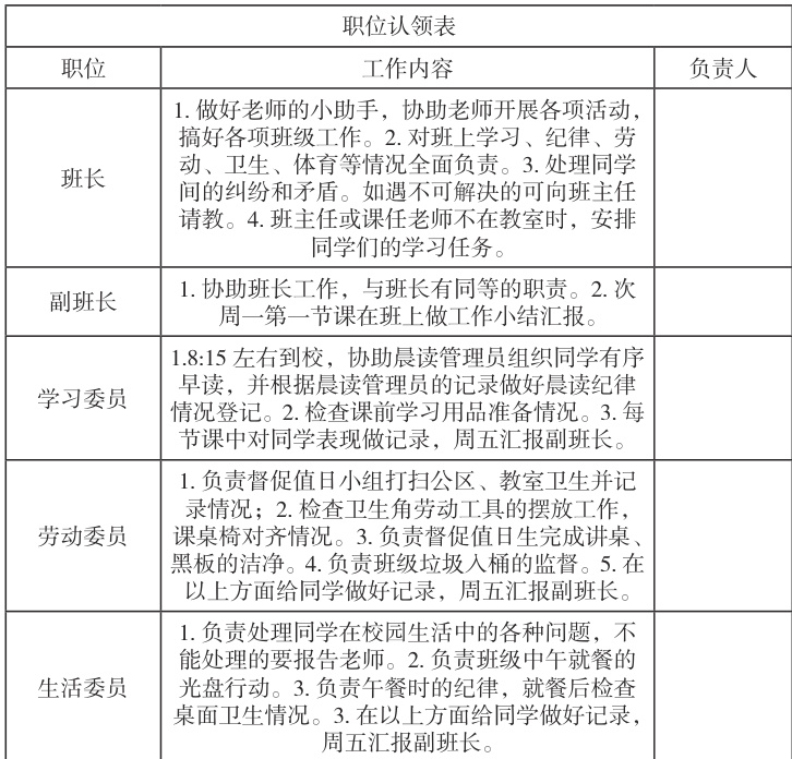 培养临时班干部一个月后,我编制职位认领表,涵盖班长、副班长等职务及详细职责,为学生和家长提供清晰岗位信息,引导学生根据自身情况选择,开启全员参与班级管理的模式。