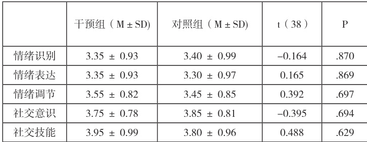 在干预实施前,研究团队通过问卷方式收集家长对幼儿情绪智力的评估数据,并对干预组与对照组进行独立样本 t 检验。结果表明,两组在情绪识别、情绪表达、情绪调节、社交意识、社交技能五个维度上的平均得分均无显著差异 Φ(Φp>.05) ),表明两组儿童在干预前的情绪智力处于相似水平。