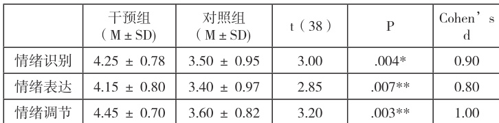 进一步分析显示,干预组各维度的 Cohen’s d 效应量均处于中等至大的水平( 0.75~1.00 ),其中情绪调节的效应量最大(
