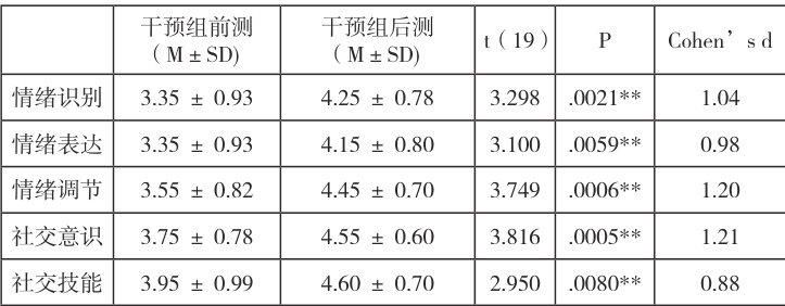 干预结束后,研究团队对干预组幼儿进行后测,并采用配对样本 t 检验分析其在情绪智力五个维度上的变化。结果表明,干预组在情绪识别、情绪表达、情绪调节、社交意识和社交技能等维度的得分均显著高于干预前水平(所有 p 值 <.05 ),其中社交意识