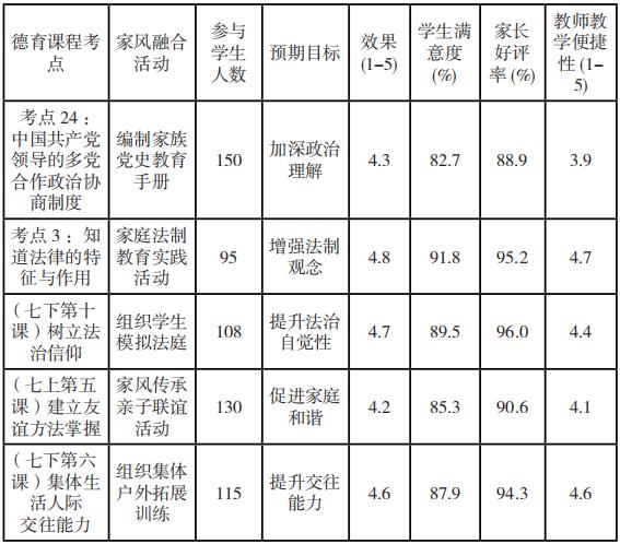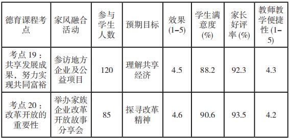 如以上案例分析显示: 1.”共享发展成果”主题活动中,通过组织学生参访地方企业及公益项目,不仅加深了学生对共享经济的理解,还获得了 4.5 分(满分 5 分 ) 的 效 果 评 分 , 学 生 满 意 度 达 88.2% 。2.”改革开放重要性”教育中,举办家族企业故事分享会,将传统家风与现代理念结合,效果评分达 4.6 分,学生满意度 90.6%。研究数据表明,家风融入德育教学具有显著成效: