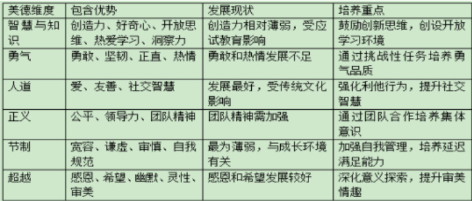 )。这一分布格局与中国传统文化的影响密切相关,儒家思想的长期教化使得友善、爱、感恩等与人道相关的品质得到较好发展;而现代社会物质条件的改善和家庭教养方式的变化,则导致谦虚、自我规范等节制品质相对薄弱。而在24 项具体优势中,大学生发展最好的前五项分别是:友善(4.45±0.51)、爱 4.32±0.49 )、感恩(4.28±0.53)、希望(4.25±0.55)和团队精神(4.22±0.57);发展相对滞后的五项则是:风趣幽默(3.05±0.71)、宽容(3.12±0.69)、勇敢(3.18±0.67)、创造力(3.21±0.66)和审慎(3.23±0.65)。这种分布特点反映了当前教育环境的某些局限:应试教育倾向抑制了创造力和幽默感的培养;过度保护的家庭教育削弱了勇敢和冒险精神;个人主义思潮的蔓延影响了宽容和审慎品质的发展。值得注意的是,积极心理品质的发展与心理健康水平密切相关。研究显示,六大美德均对心理健康有正向预测作用,其中人道、正义和超越的预测力最强。这些发现为将优势培养纳入心理健康教育体系提供了实证支持。