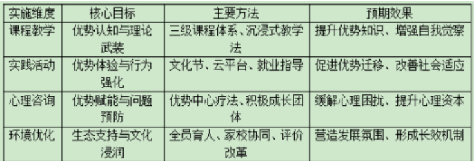 综上所述,大学生优势培养教育需要课程、活动、咨询和环境四维并举,形成系统化、科学化的干预体系。这一体系以优势识别为基础,以优势激活为关键,以优势运用为目标,通过多元方法和多方协同,促进大学生积极心理品质的全面发展。