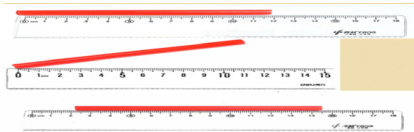 师生齐诵:“一贴(物体贴尺边)!二对(起点对准0)!三平(尺物不歪斜)!”