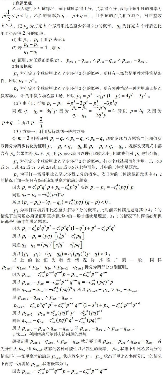 通过对该题的分析研究发现高中数学教学必须重视数学核心素养的培育。此题中学生需将乒乓球练习这一现实情境抽象为概率模型,是数学抽象素养的体现;在证明过程中,从特殊情形推导至一般情况,对逻辑推理素养提出要求;构建重复独立事件概率模型的过程,是数学建模素养的运用;对事件概率关系的分析与计算,离不开数学运算素养。因此在日常教学中要从 “知识灌输” 转向 “素养培育”,将课堂重心放在引导学生用数学视角洞察现实、用逻辑思维拆解问题、用数学模型解决实际需求上。通过重构教学内容体系,把抽象、推理、建模等素养目标融入各章节教学,而非仅关注零散知识点。同时,以真实情境问题为载体,让学生在完整的 “发现问题 — 构建模型 — 解决问题” 过程中,逐步形成数学思维方式,实现从 “学会解题” 到 “会用数学” 的深层跨越。