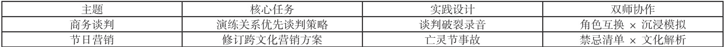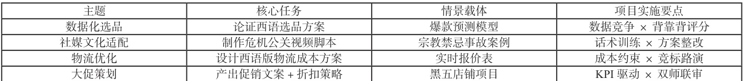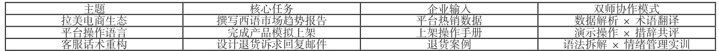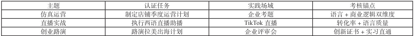 该课程重构针对西班牙语专业大三学生,以深度绑定企业需求为核心:邀请企业开发课程模块,使学生掌握真实平台操作术语(语言 + 技能);采用双师协同教学,通过企业导师指导实时工单处理(技能)与跨文化场景经验传递(文化);植入企业失败案例(DECA 库)和实时运营问题,训练文化风险决策(文化)与危机话术(语言);设计“认知→模拟→实战→孵化”进阶实践,在仿真项目中融合三维能力解决复杂商业问题。