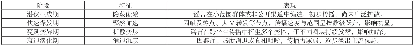 重大网络谣言的传播并不是杂乱无章的,其生命周期普遍存在一个动态演进的轨迹,可划分为四个主要阶段,具体如表1.3.1 所示。