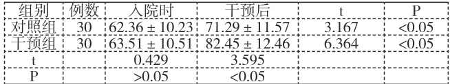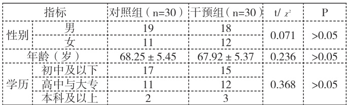 以我科室 2022 年 1 月 -2023 年 6 月接诊的 60 例脑梗死患者作为研究对象。(1)纳入标准:所有患者均根据《各类脑血管疾病诊断要点》中相关标准确诊,同时经过CT 或者MRI 进一步确诊;患者为首次发病;得到充分救治后表现出肢体运动功能障碍;病情恢复稳定,神经意识清楚,能够配合医护工作;知情同意。(2)排除标准:既往有脑梗死疾病病史;发病前就表现出肢体功能障碍,或者缺乏独立生活能力;精神障碍、认知功能受损等无法配合沟通交流的患者;合并有其他严重并发症。按照随机数字表法将其分为对照组与干预组,各组患者 30 例,两组患者一般资料比较(见表 1),差异无统计学意义( P>0.05 ),具有可比性。